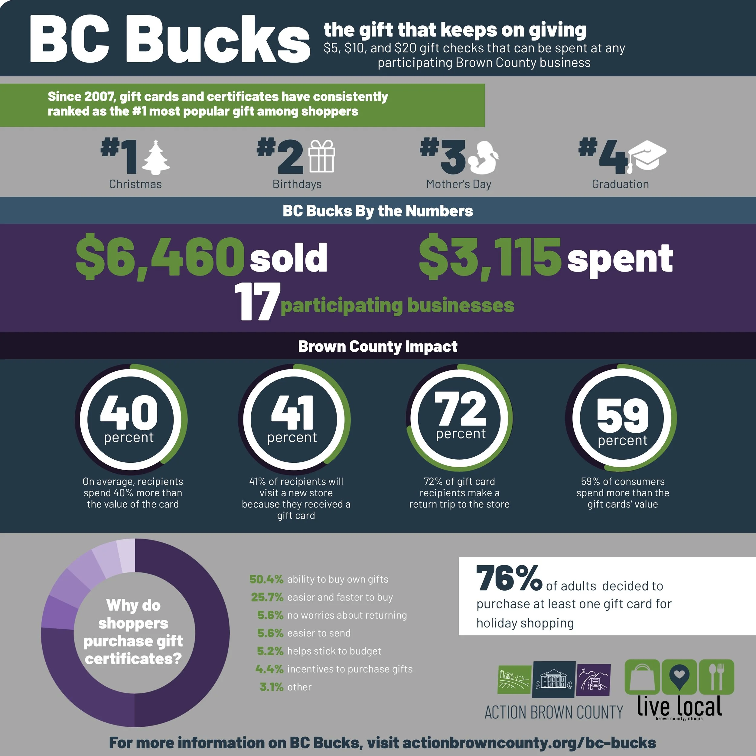 BC Bucks is a gift certificate/check program designed to stimulate brown county’s local economy and support businesses by encouraging and enabling residents to spend their money locally.
